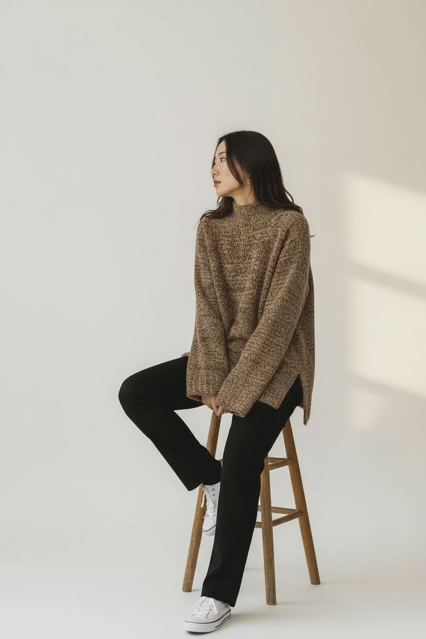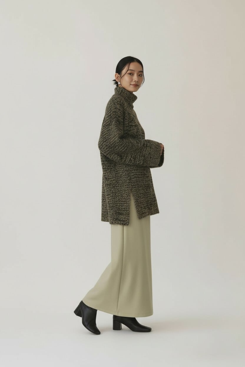 表情のある特殊糸をMIXしたゆったりニットで、前裾のスリットが抜け感をプラス。