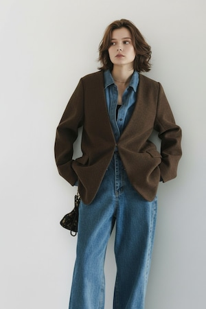柔らかなウールライク素材を使用したノーカラージャケットで、すっきりとした首まわりが洗練された印象を演出。