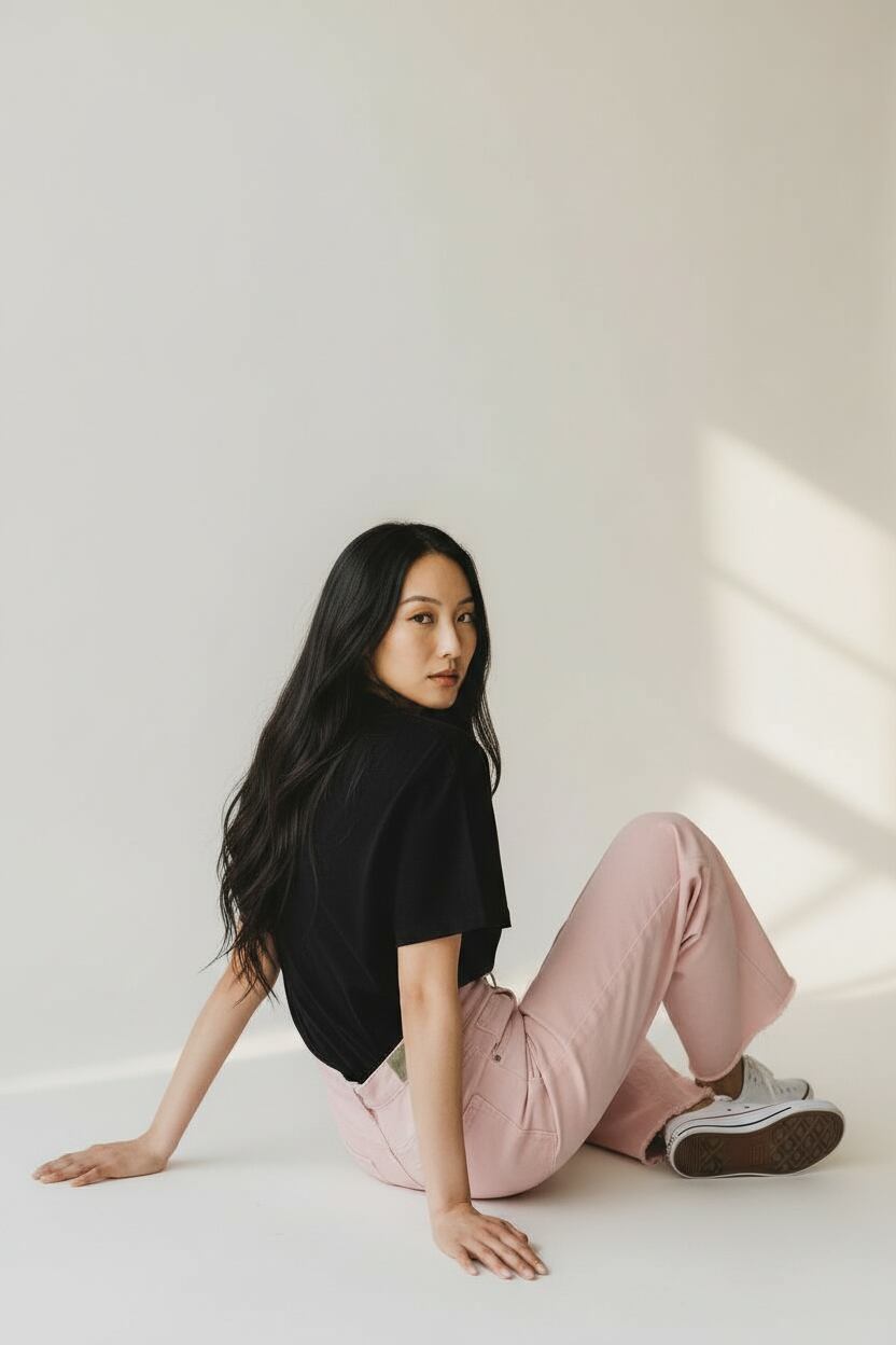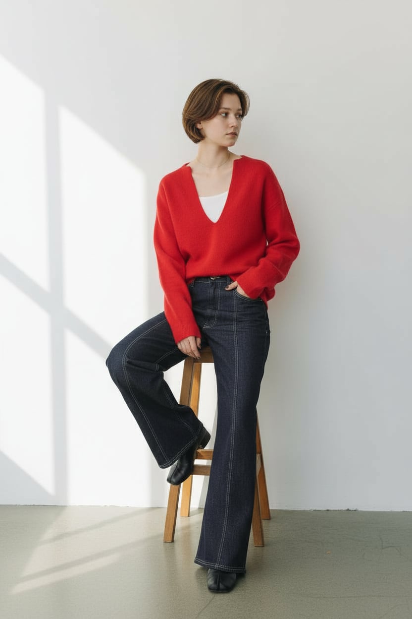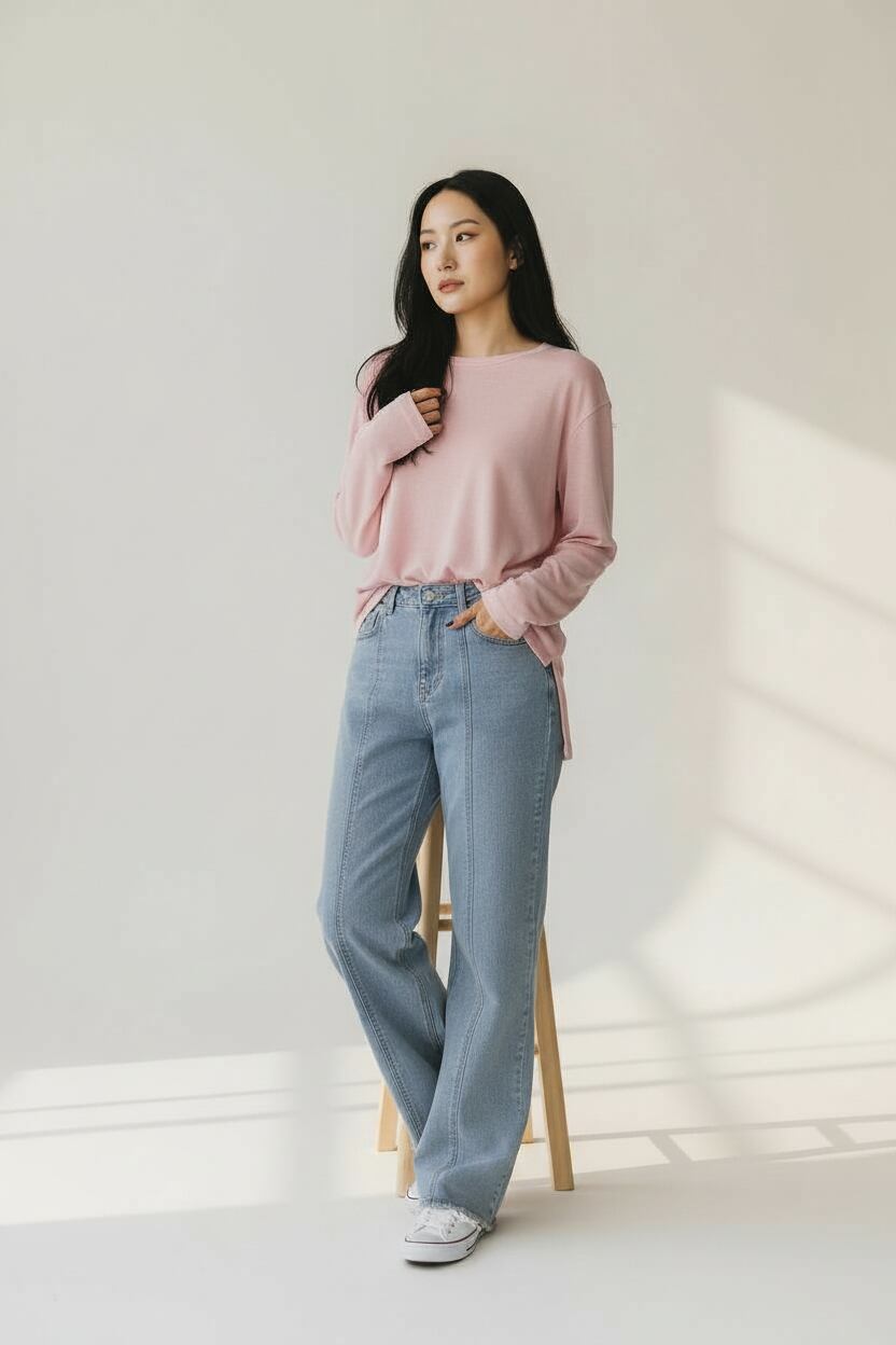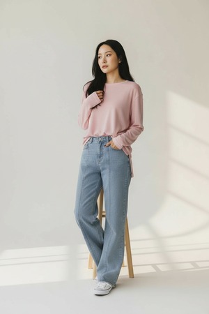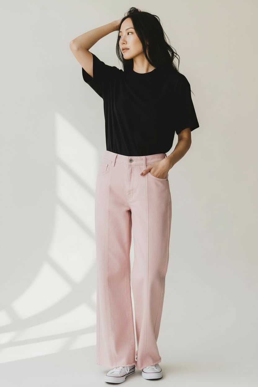 ハイウエストとフロントステッチがIラインを強調し、すっきりとしたトレンドシルエットを叶えるデザイン。