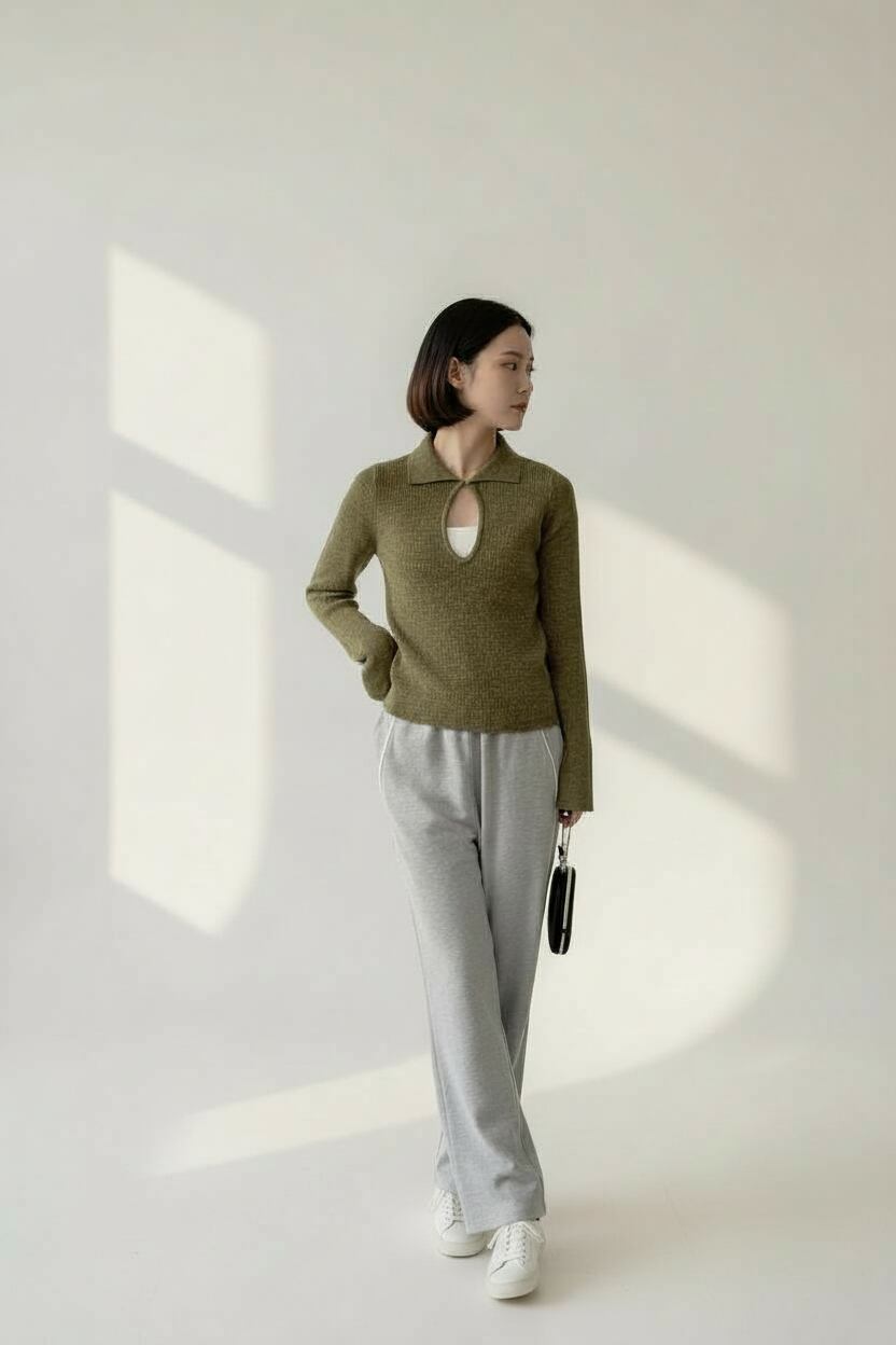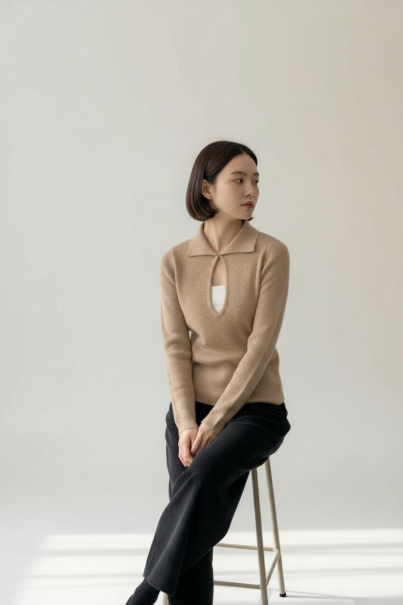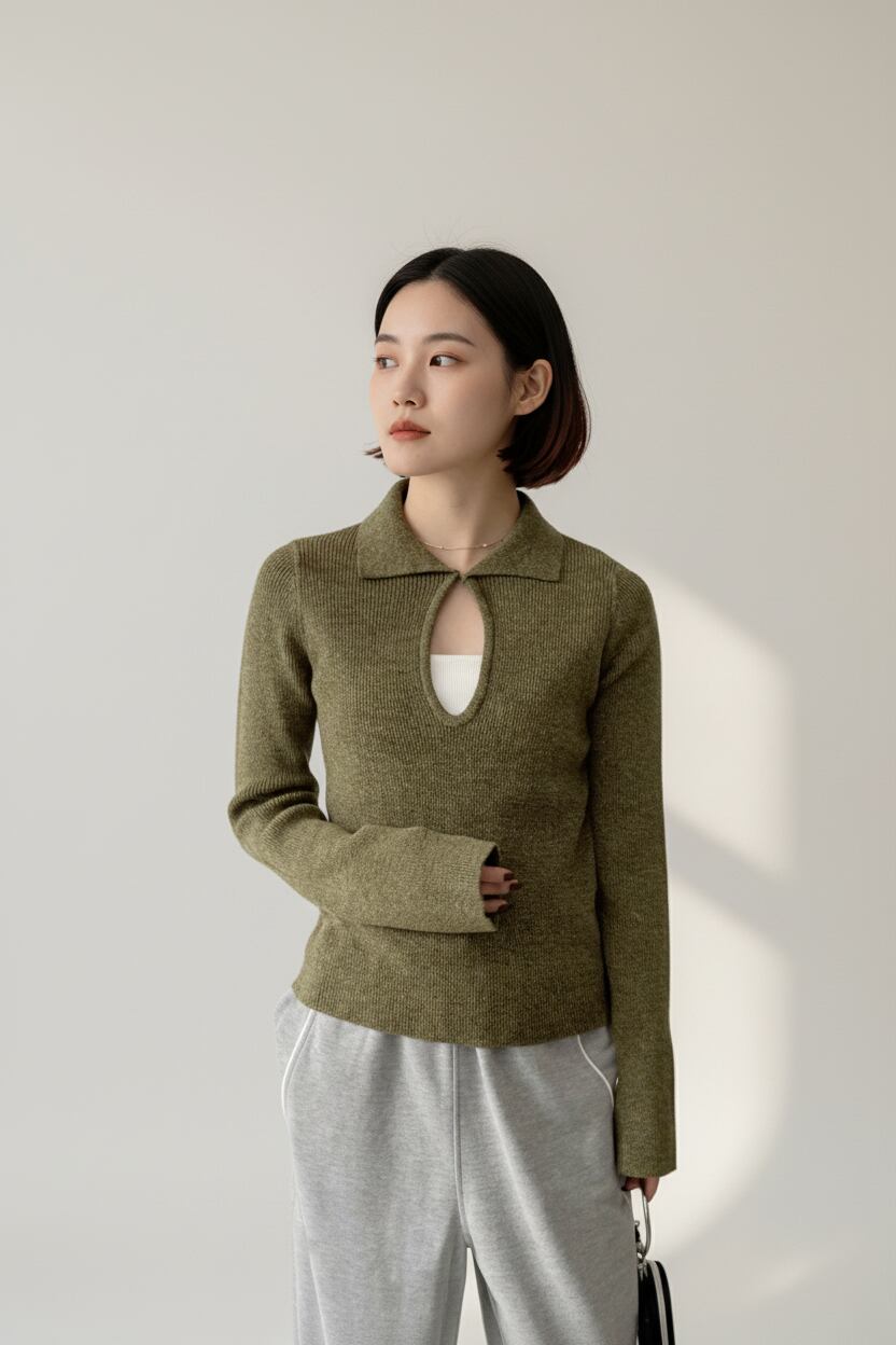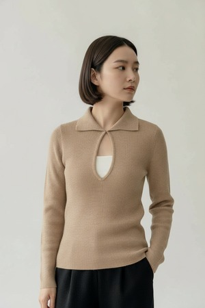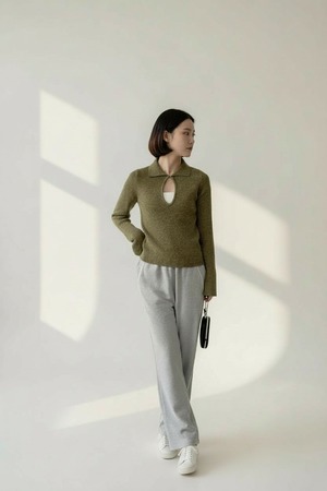 フロントはホック付きのキーネックデザインで、さりげない抜け感とこなれ感を演出します。