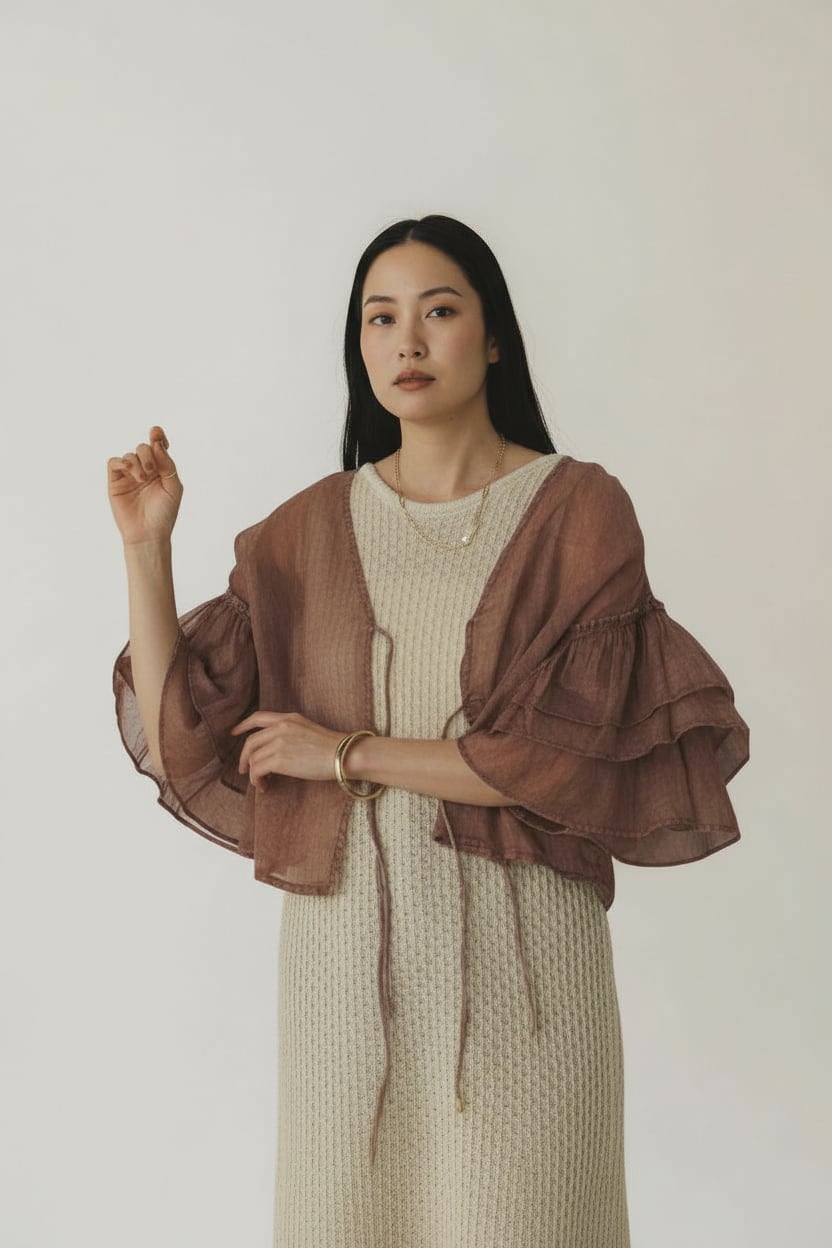 袖のふわっとしたフリルが二の腕をさりげなくカバーし、前リボンで“大人のかわいさ”を演出するカーディガン。