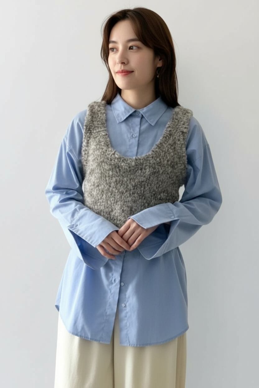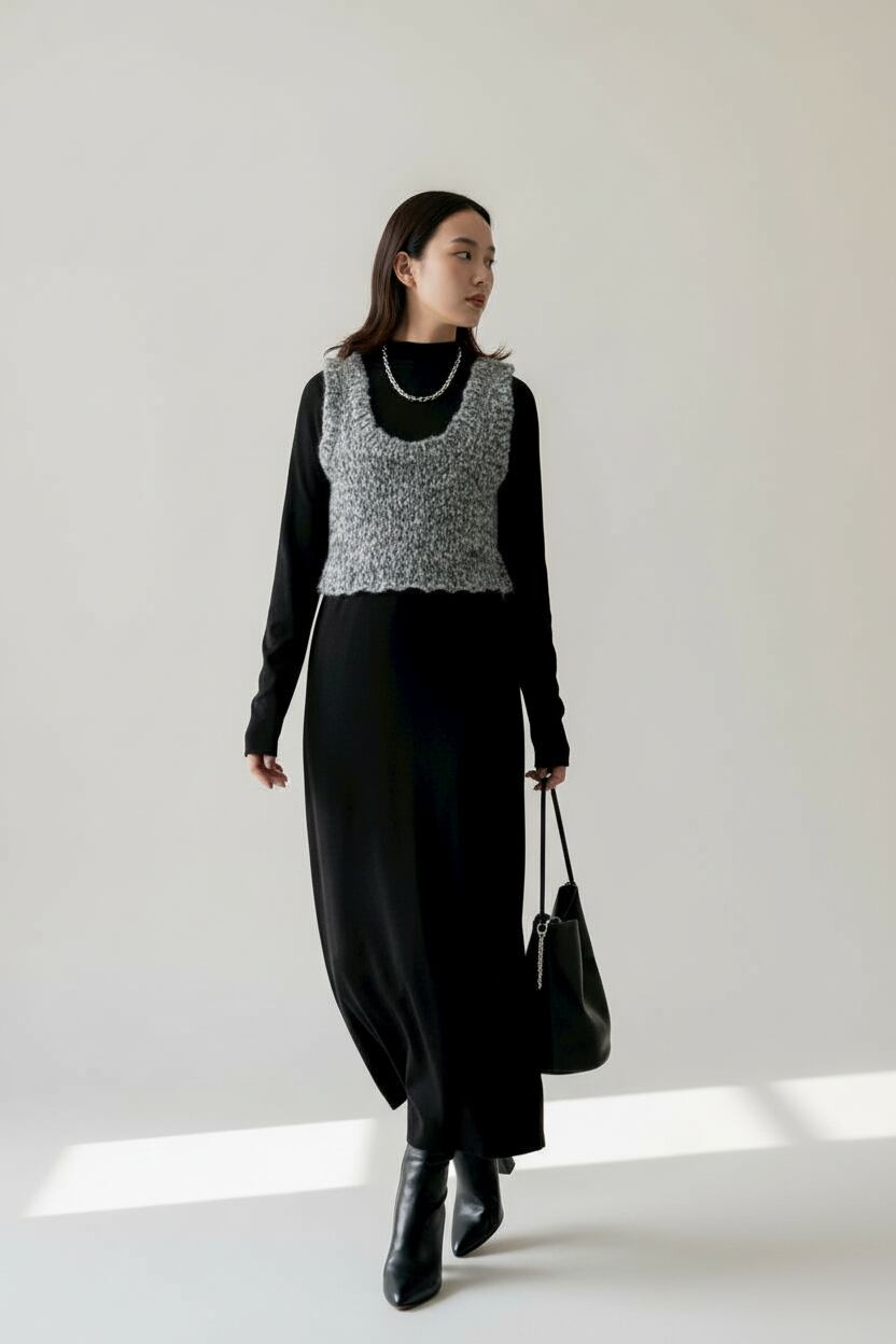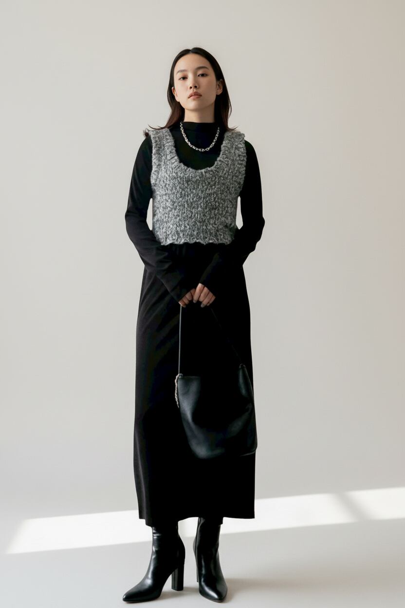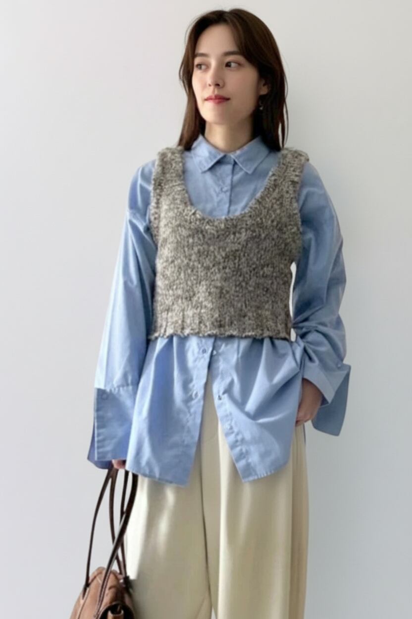 表情豊かなミックス糸とざっくり編みが、スタイリングに立体感と旬のムードをプラスするニットビスチェ。