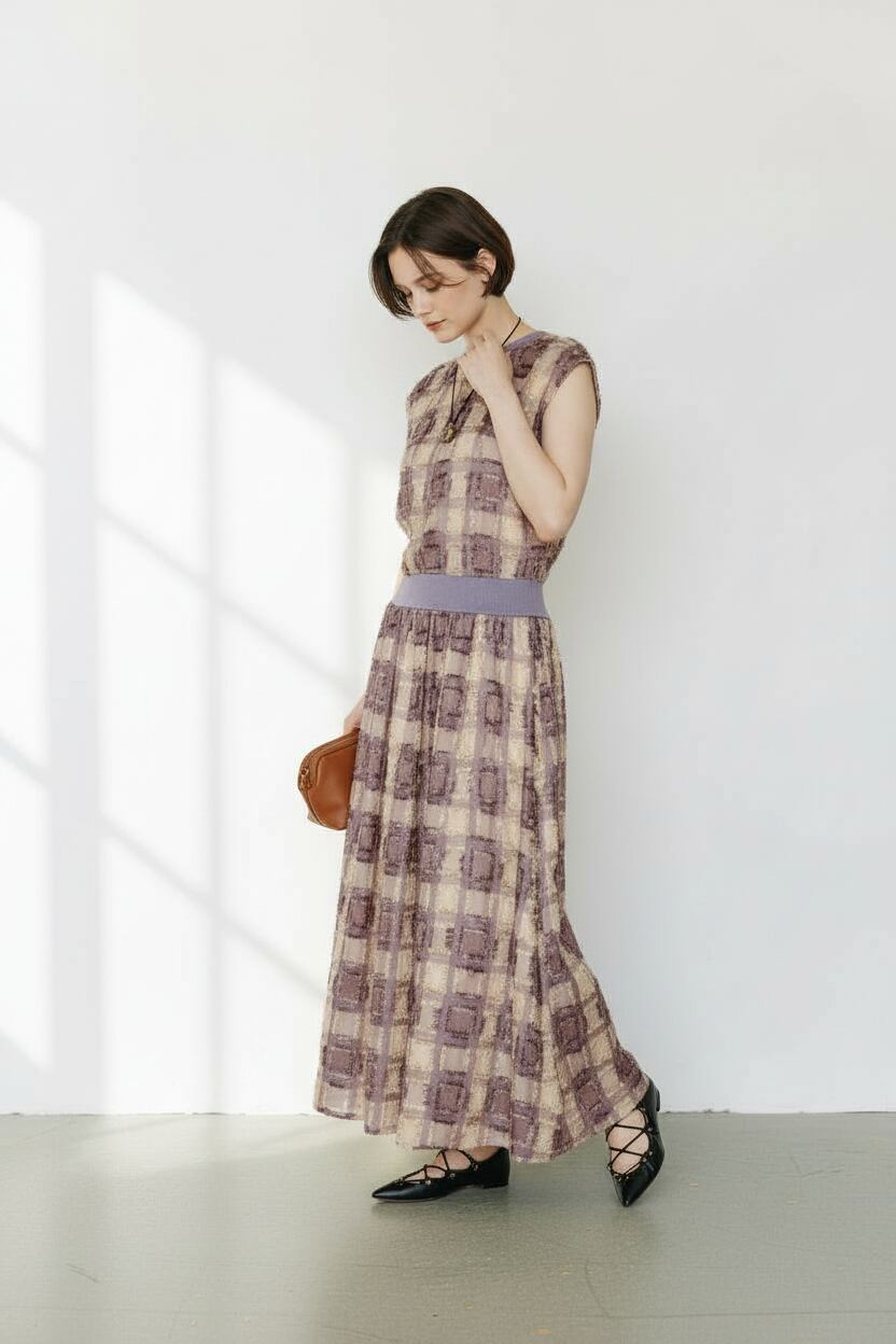 短めで程よいフリンジとブロック状の表現が、着用しやすさと立体感を両立します。