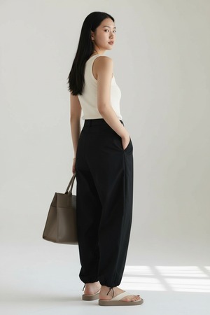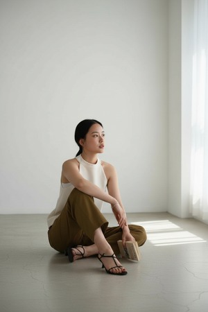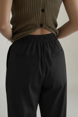 フロントファスナーとバックゴム仕様で、上品さとリラックス感を両立。