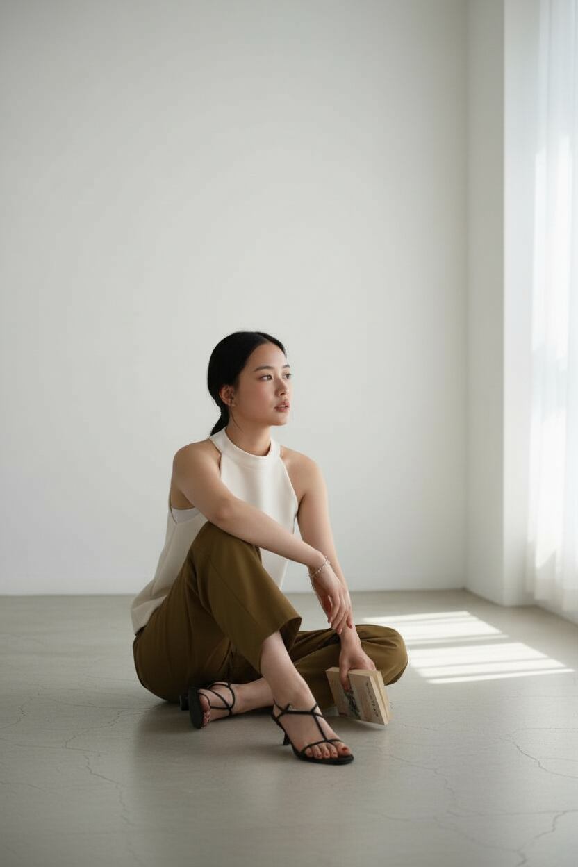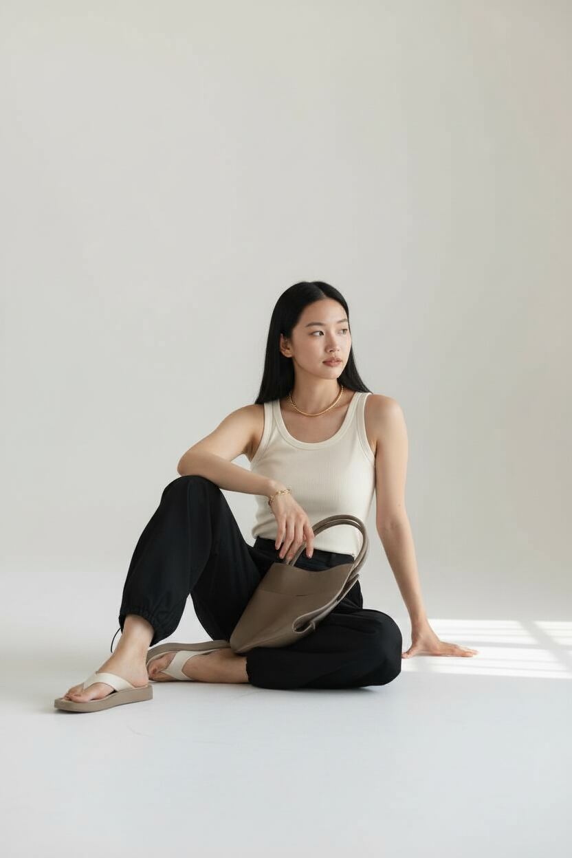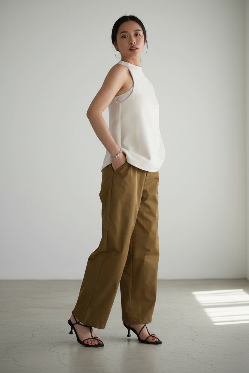 やや光沢のある素材が、カジュアルながら洗練されたスタイリングを完成させます。