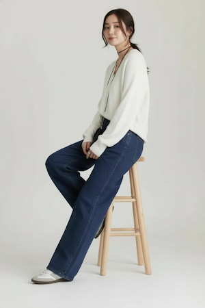 サイドの切り替えラインが縦のラインを強調し、脚をすっきりと見せるデニムワイドパンツ。