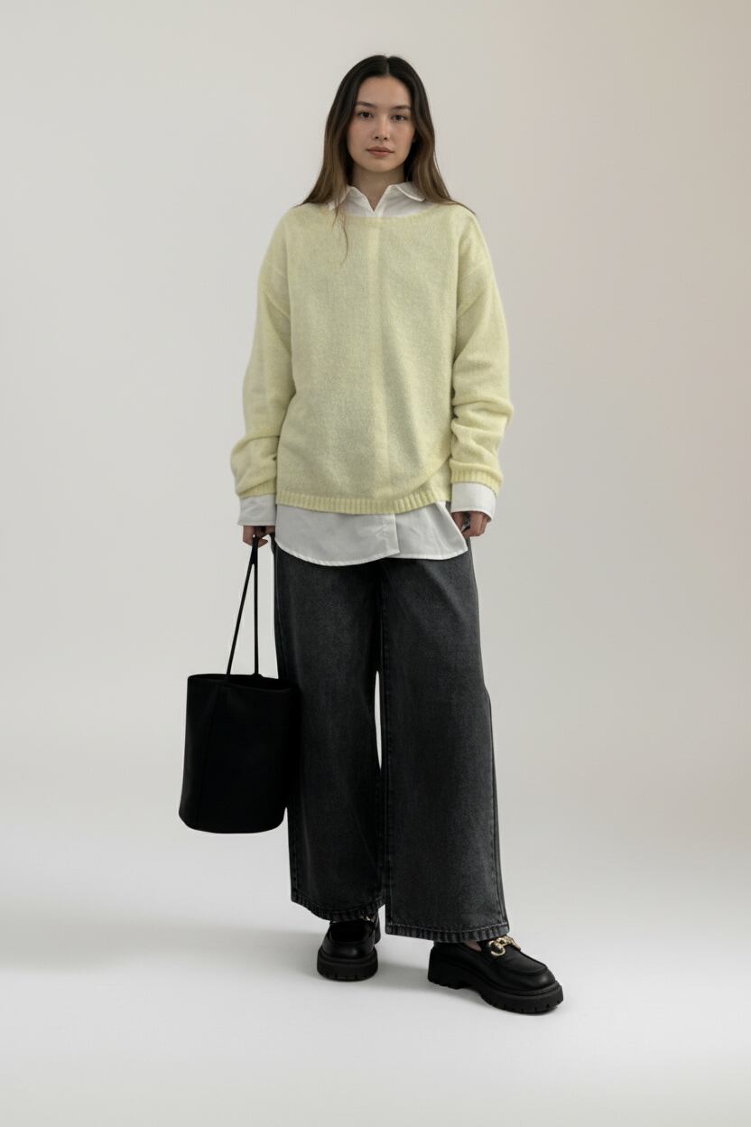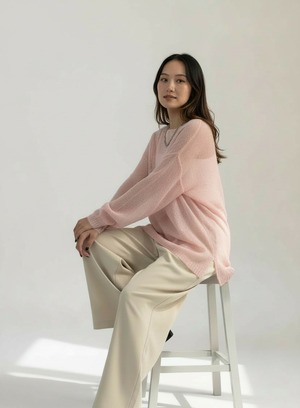 程よく横に開いたネックラインが顔まわりをすっきりと上品に見せ、軽やかな透け感と柔らかな起毛感が魅力です。