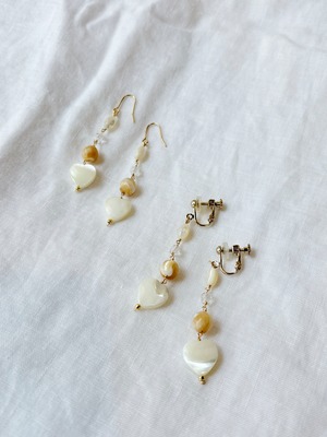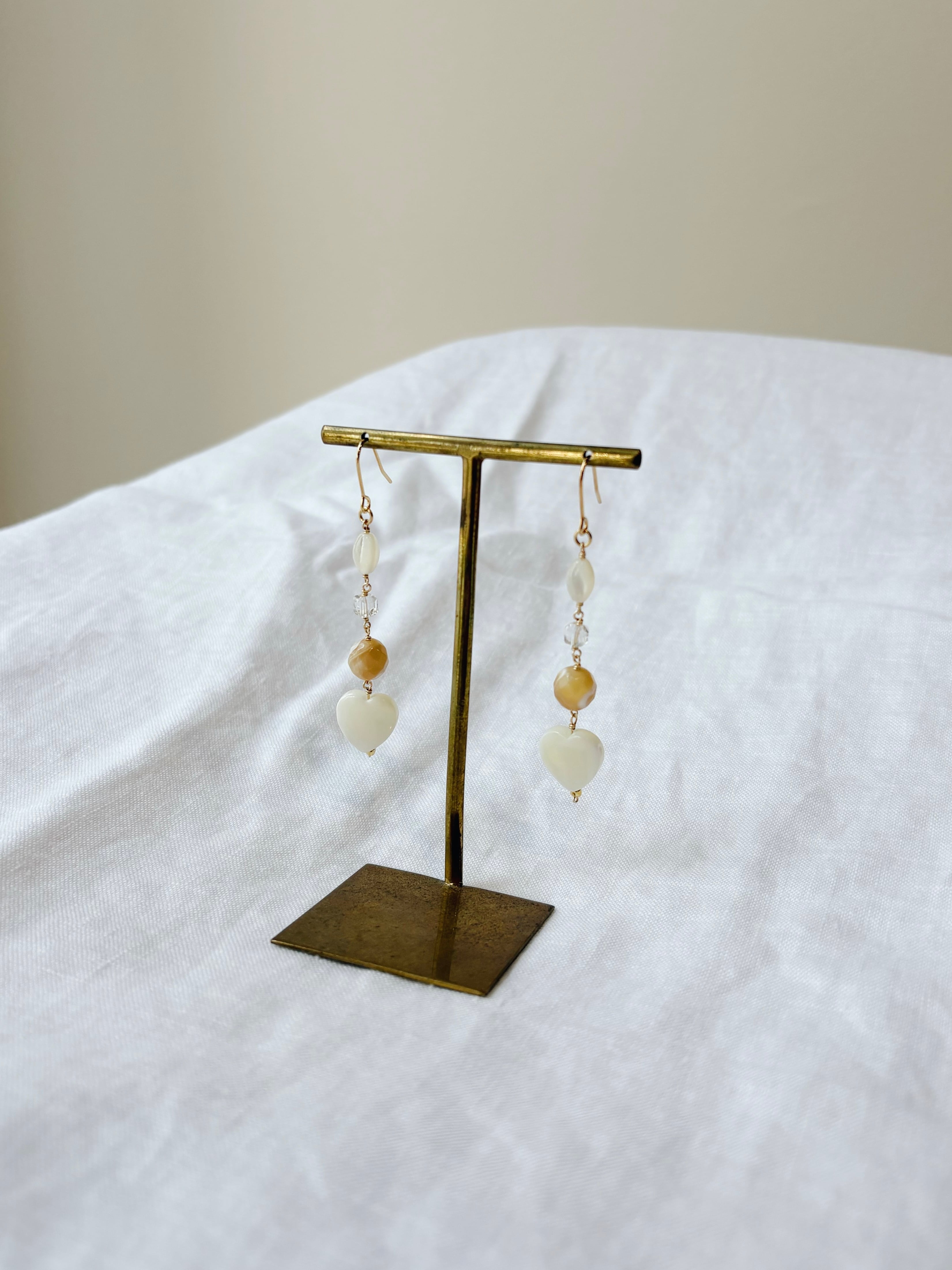 天然シェルのハートモチーフが揺れる、女性らしいロングピアス。