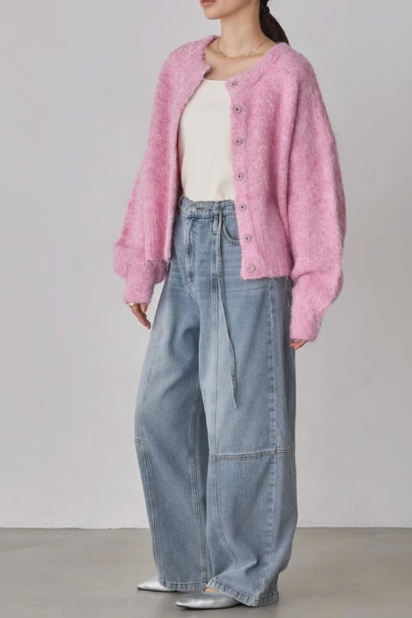 裾にかけてなだらかにカーブを描くバレルレッグシルエットが特徴のデニムパンツ。