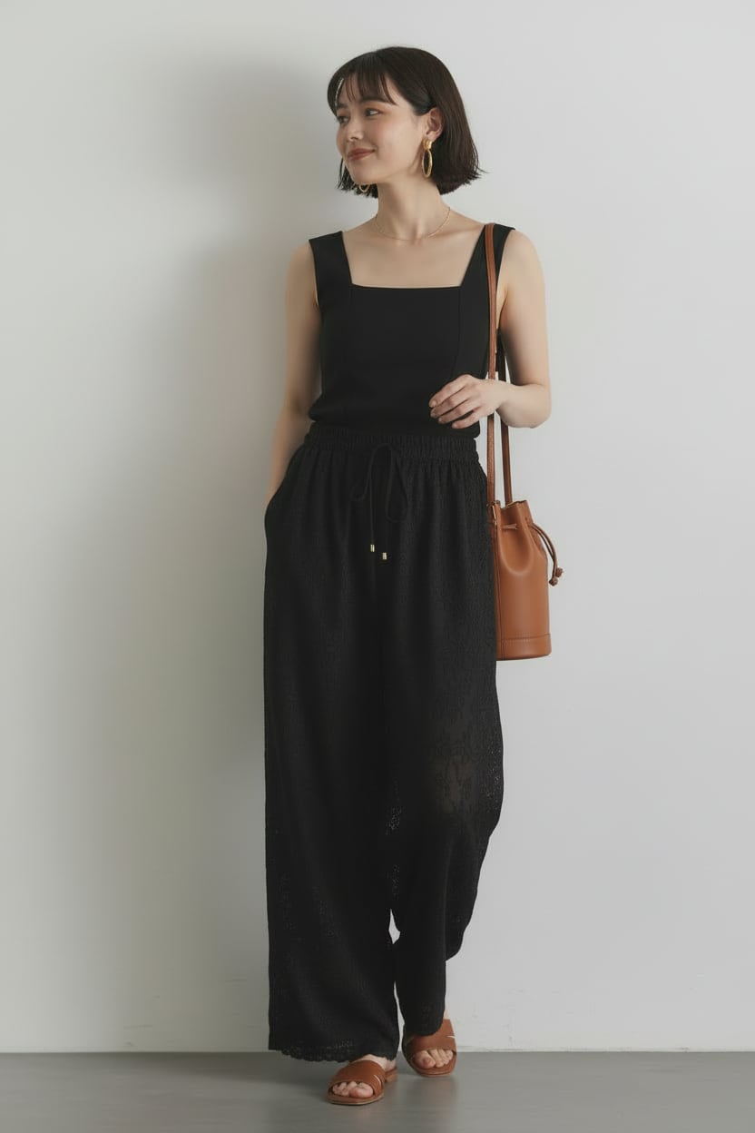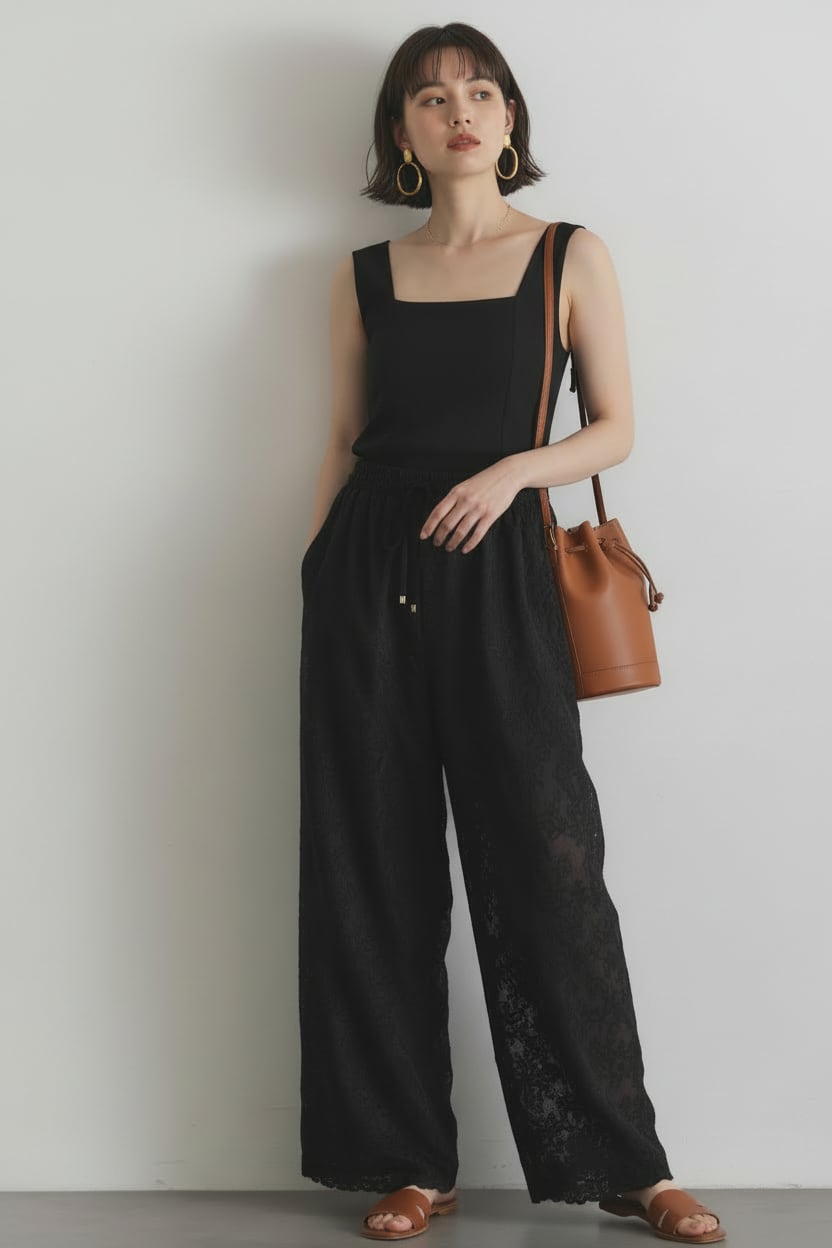 ウエストは総ゴム+ドロスト仕様でリラクシーな穿き心地ながら、裾のスカラップ刺繍レースが上品なアクセントを添えるイージーパンツ。
