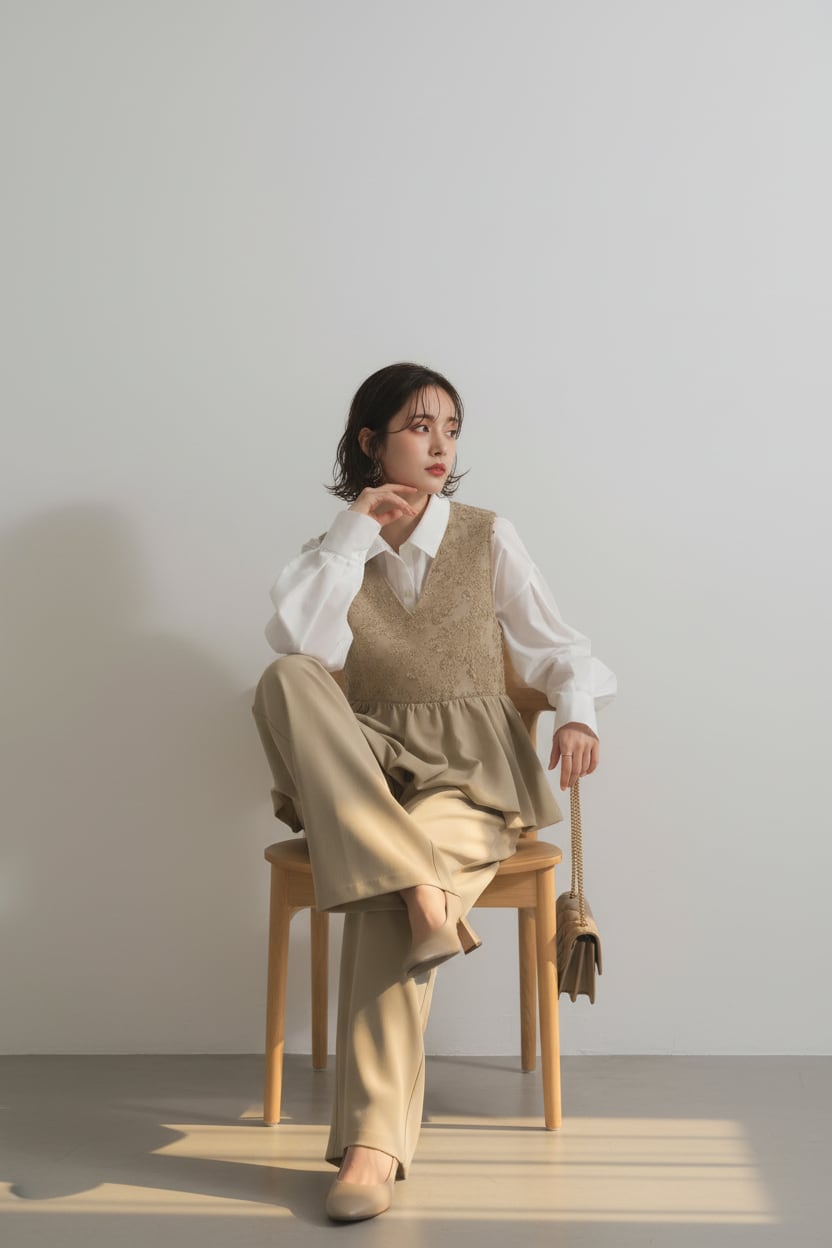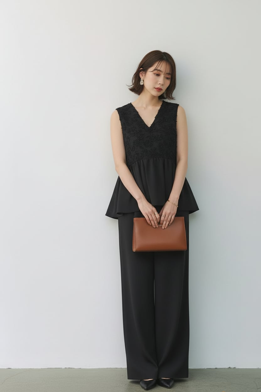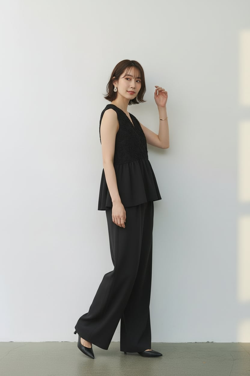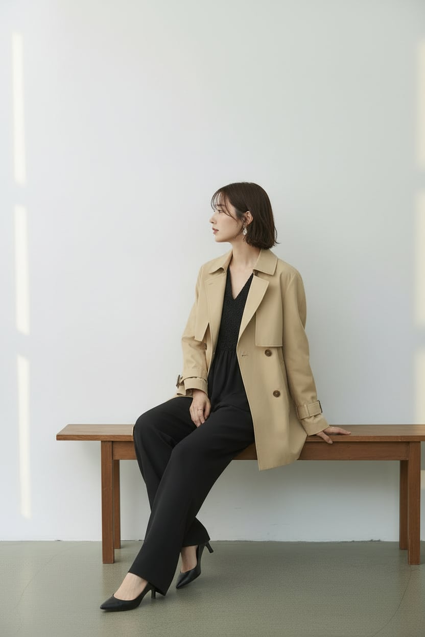 ウエスト位置を高く見せる切替と縦ラインを強調するシルエットで、きちんと感とスタイルアップを両立します。