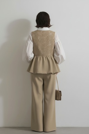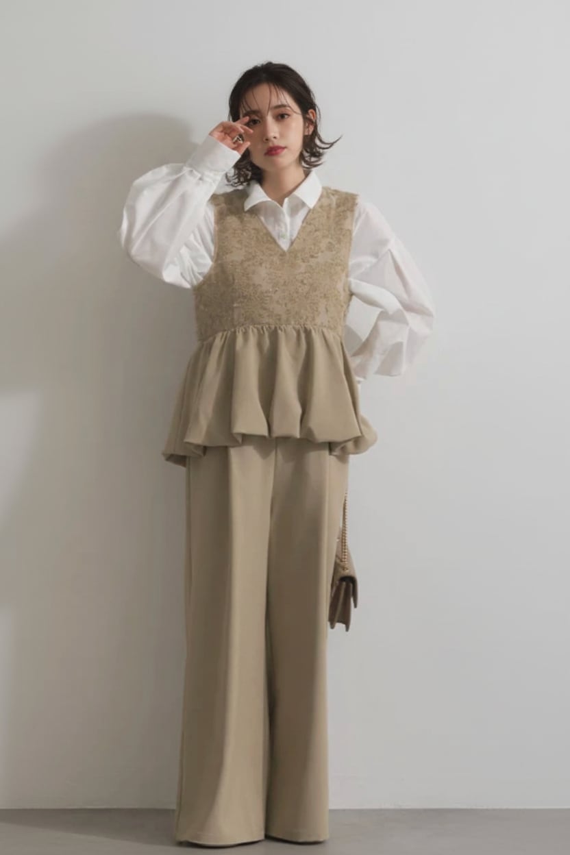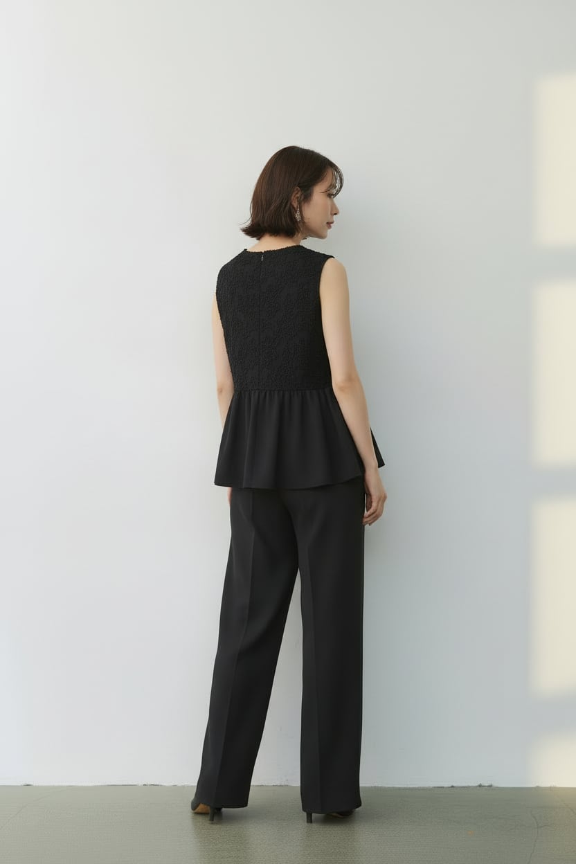 華やかなジャガードレーストップスとペプラムをドッキングした、レイヤード風サロペットパンツドレス。