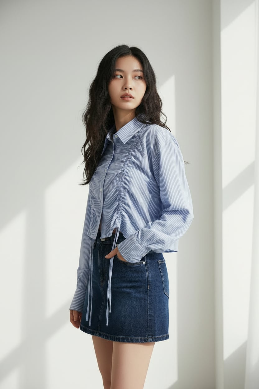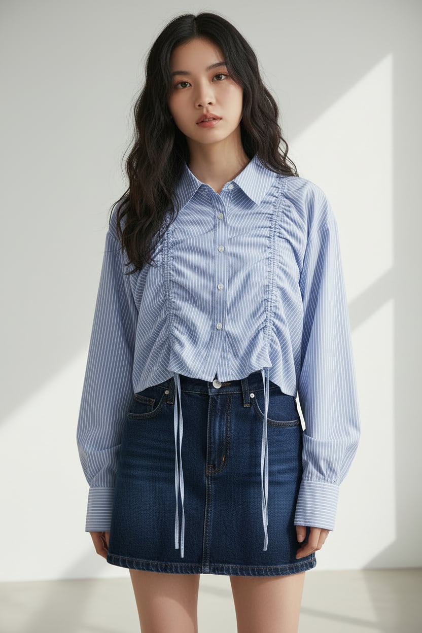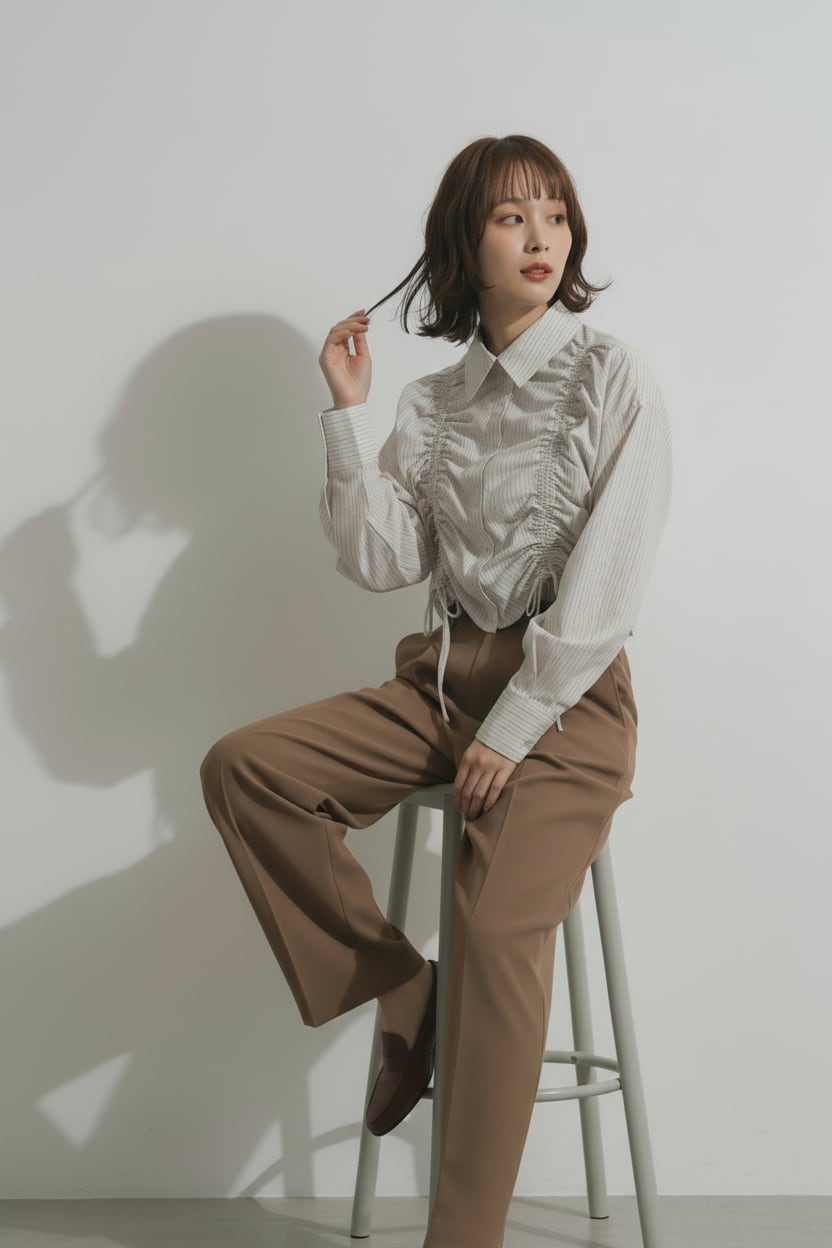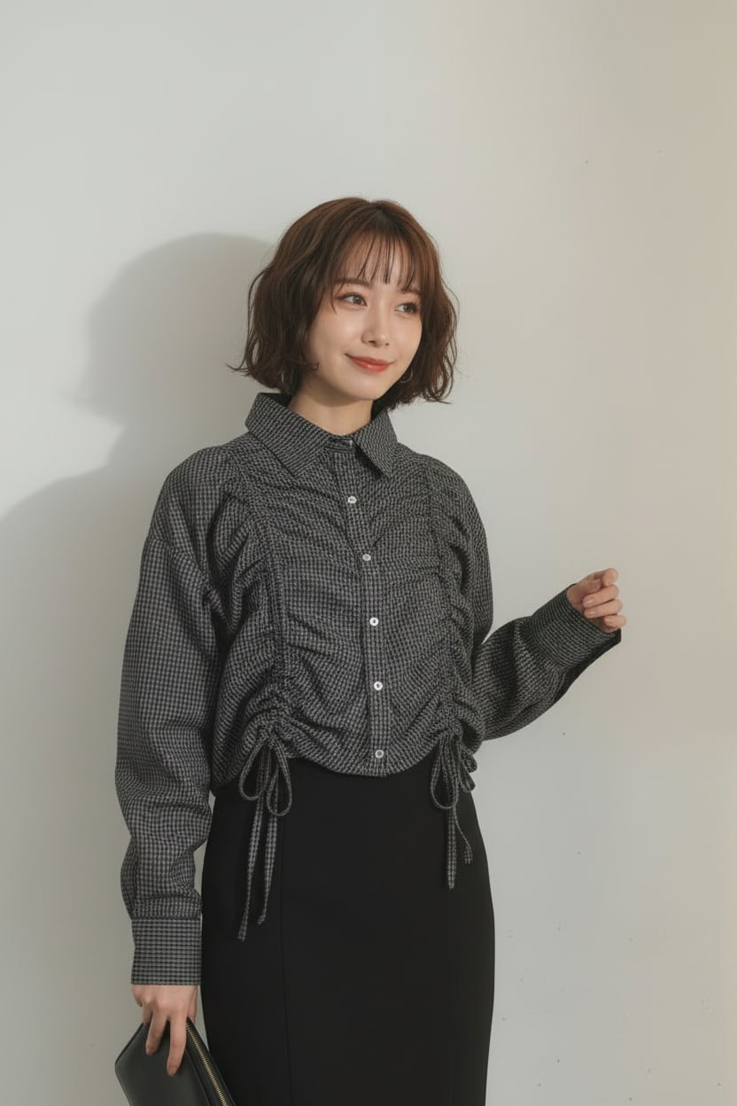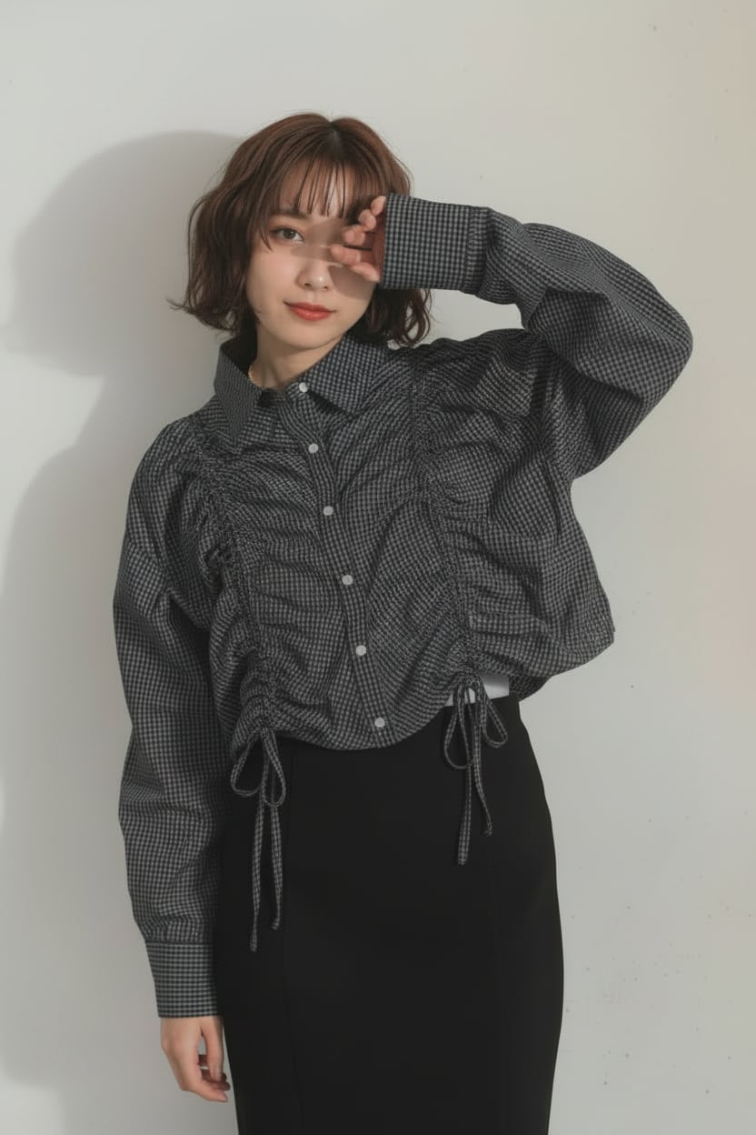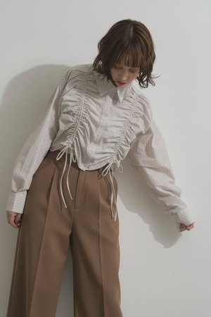 フロントのシャーリングが目を惹くショート丈シャツで、ギャザーの立体感が女性らしいシルエットを演出。