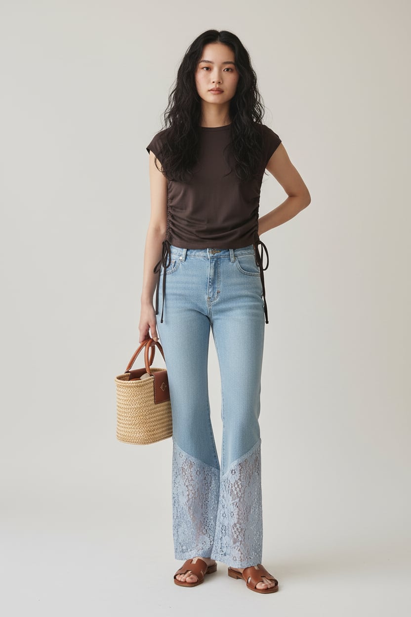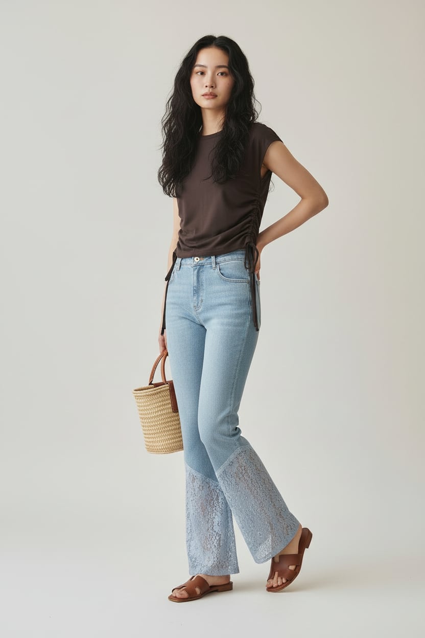 裾レースの切り替えが目を惹く、存在感のあるフレアデニムパンツ。