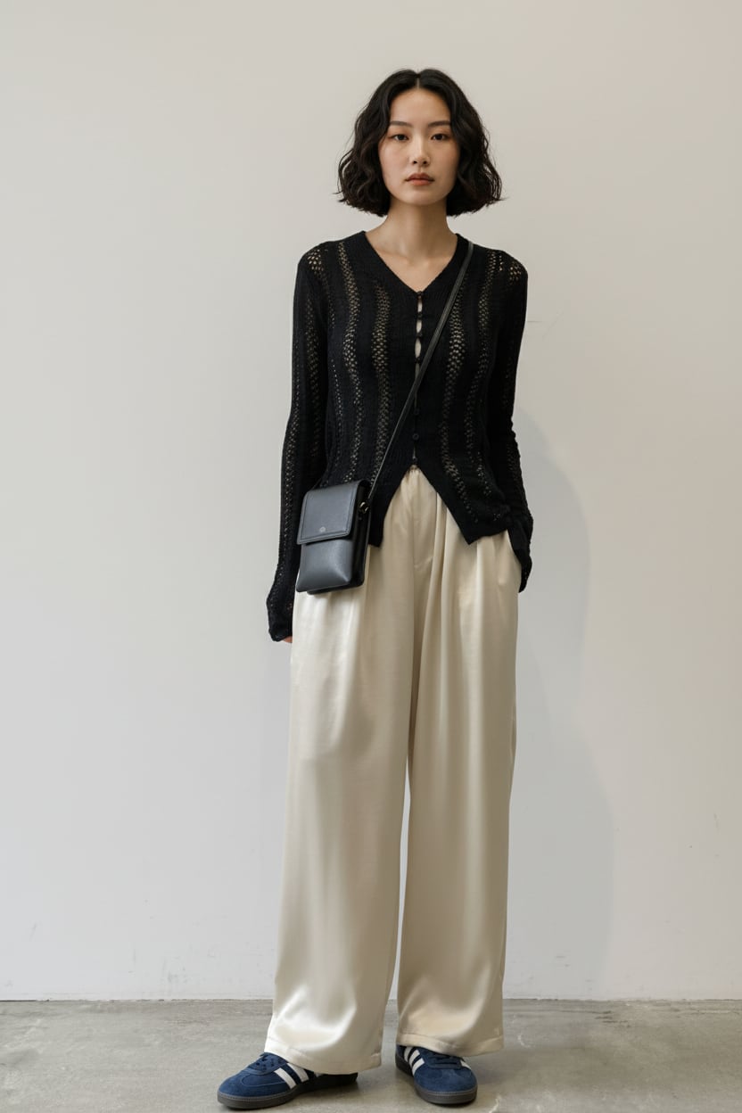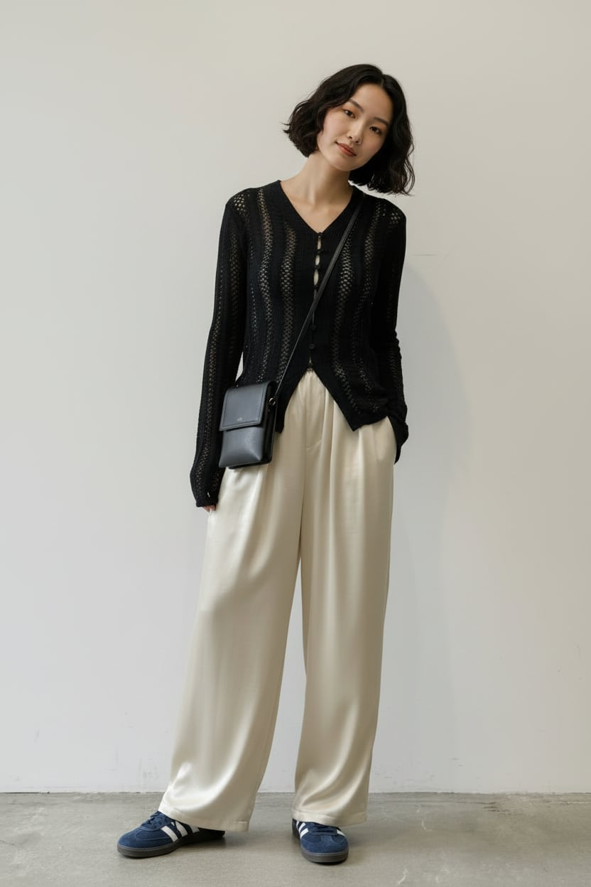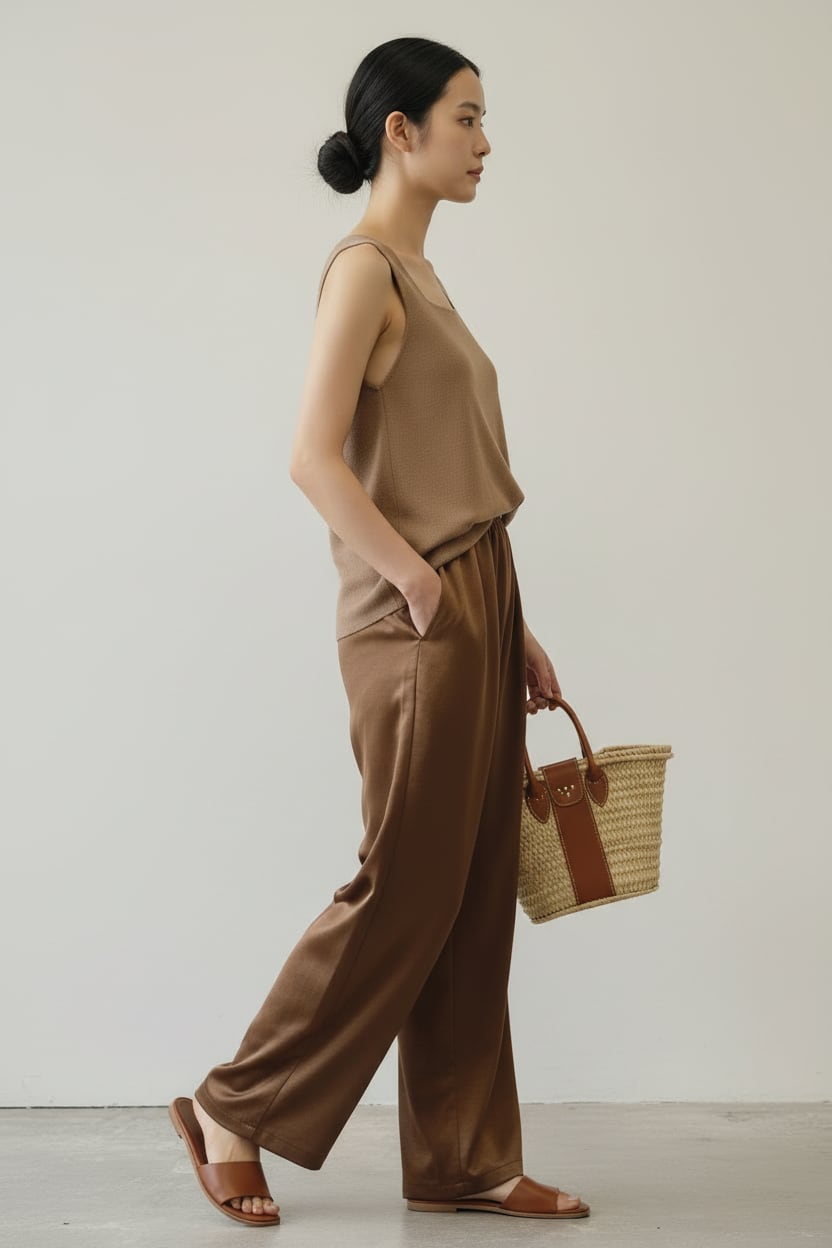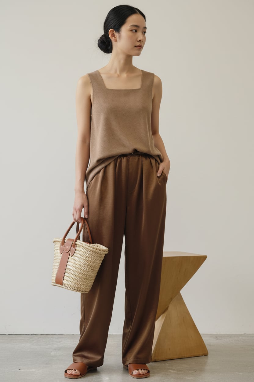 程よいツヤ感のあるサテン素材を使用した、万能イージーパンツ。