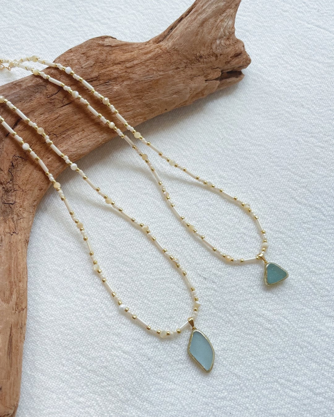 ビーチで見つかるシーグラスを使用したネックレス。